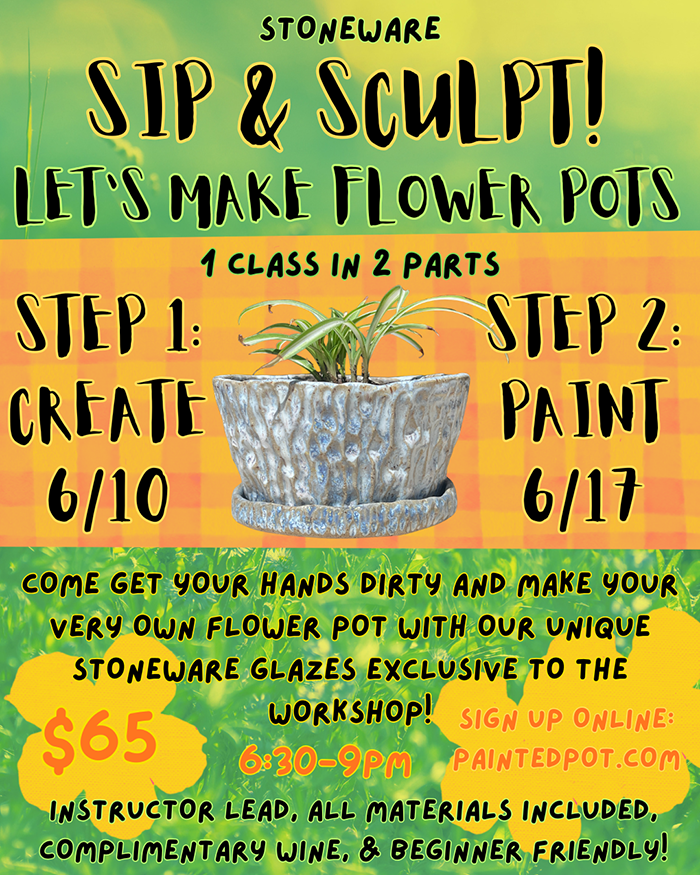 Part 2- Wednesday June 17th, 6:30-9pmCome get your hands dirty and make your very own flower pot with our stoneware clay!