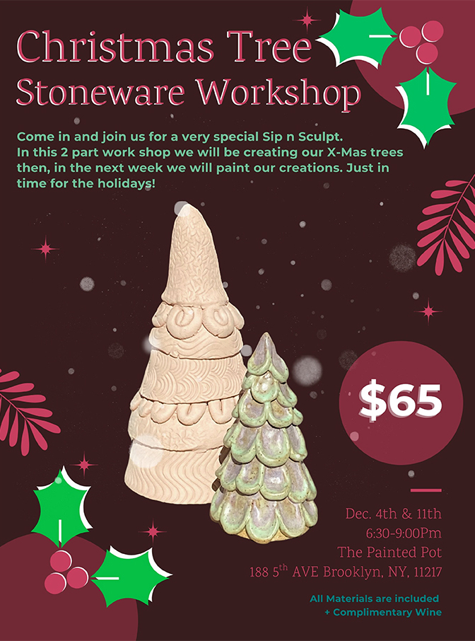 Tis the season to create something special. Join us this holiday season to create a stoneware Christmas tree. This is a beginner friendly 2 part workshop. On the first day we will work to sculpt your tree, then the following week we will glaze your creation