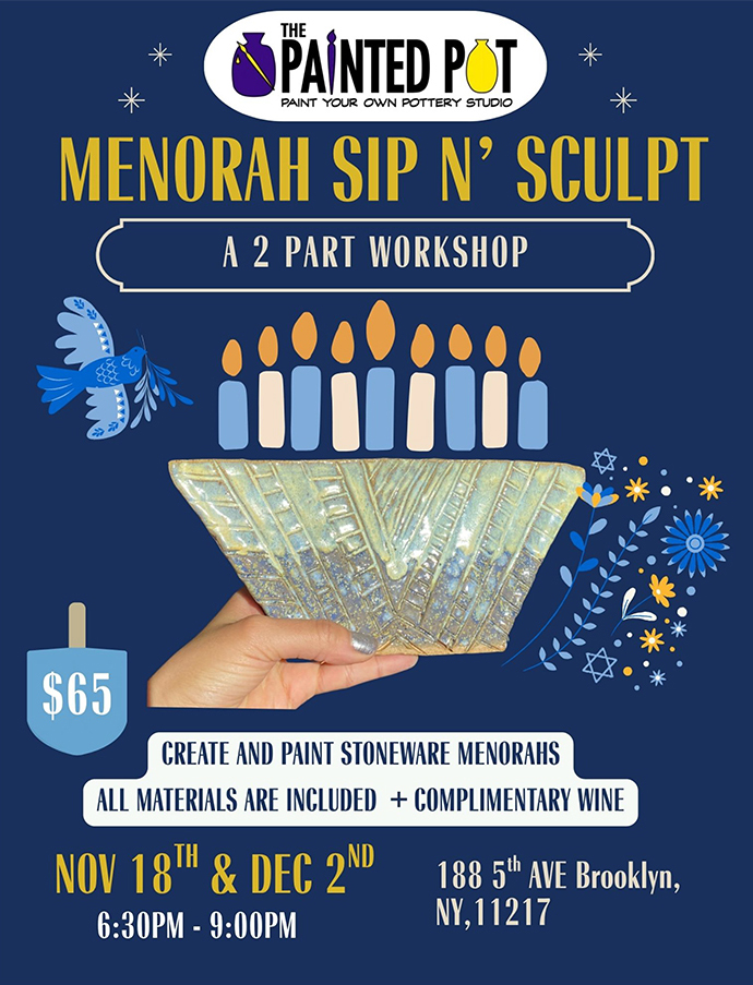 We're excited to announce an upcoming stoneware menorah workshop at The Painted Pot! This is a unique opportunity to create a beautiful and functional menorah. This is a two part class, we will build one day then once they are fired we will glaze our creations. No prior pottery experience is necessary – our instructors will guide you through every step.
